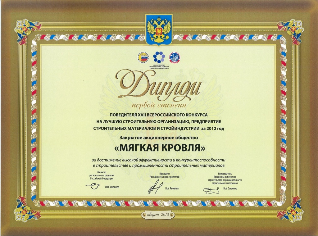 Теперь наше предприятие по производству кровельной и гидроизоляционной продукции «Мягкая кровля» занимает почётное место в рейтинге лидеров строительного комплекса России по итогам 2012 года.