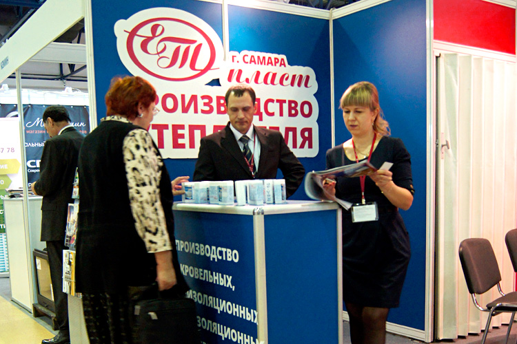 На стенде самарских заводов «Мягкая кровля» и «ЕТ-Пласт» был представлен широкий ассортимент кровельных, гидроизоляционных и теплоизоляционных материалов: