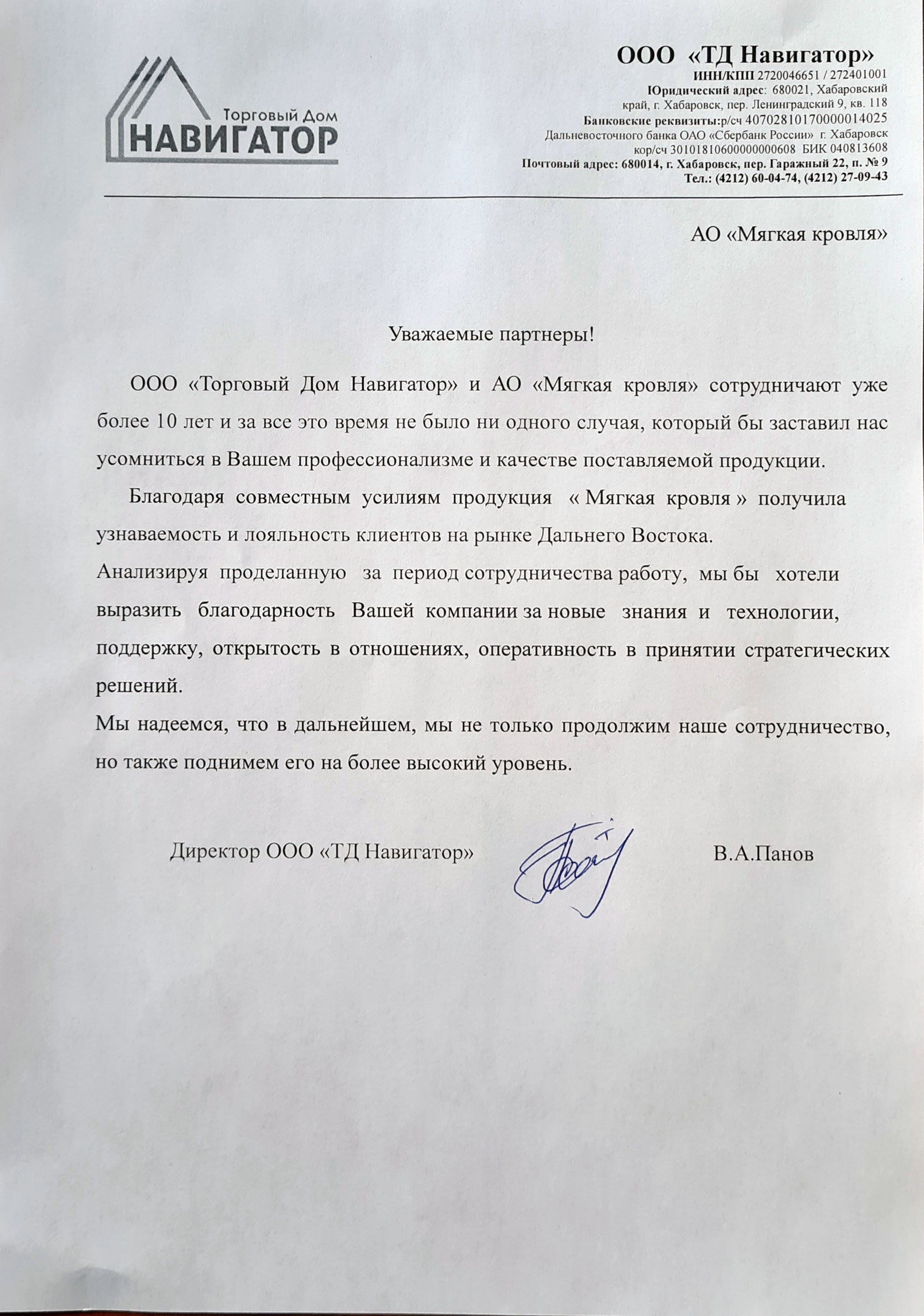 ООО «Торговый Дом Навигатор» и АО «Мягкая кровля» сотрудничают уже более 10 лет и за все это время не было ни одного случая, который бы заставил нас усомниться в Вашем профессионализме и качестве поставляемой продукции.